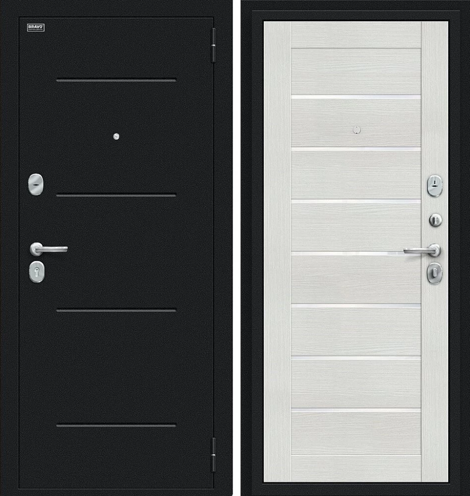 Надежная входная Дверь Браво Техно Букле черное/Bianco Veralinga премиум класса по цене 32 417 руб. Большая толщина стали защитит от проникновения в ваш дом, квартиру или коттедж. Используется очень качественная фурнитура: замки, цилиндры, ручки, защелки. Покрытие и отделка двери изготовлено под внимательным контролем производителя. Дверь имеет долгий срок службы и гарантию.