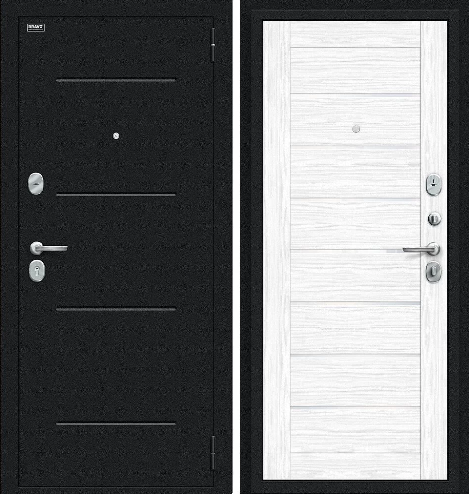 Надежная входная Дверь Браво Техно Букле черное/Snow Melinga премиум класса по цене 32 417 руб. Большая толщина стали защитит от проникновения в ваш дом, квартиру или коттедж. Используется очень качественная фурнитура: замки, цилиндры, ручки, защелки. Покрытие и отделка двери изготовлено под внимательным контролем производителя. Дверь имеет долгий срок службы и гарантию.