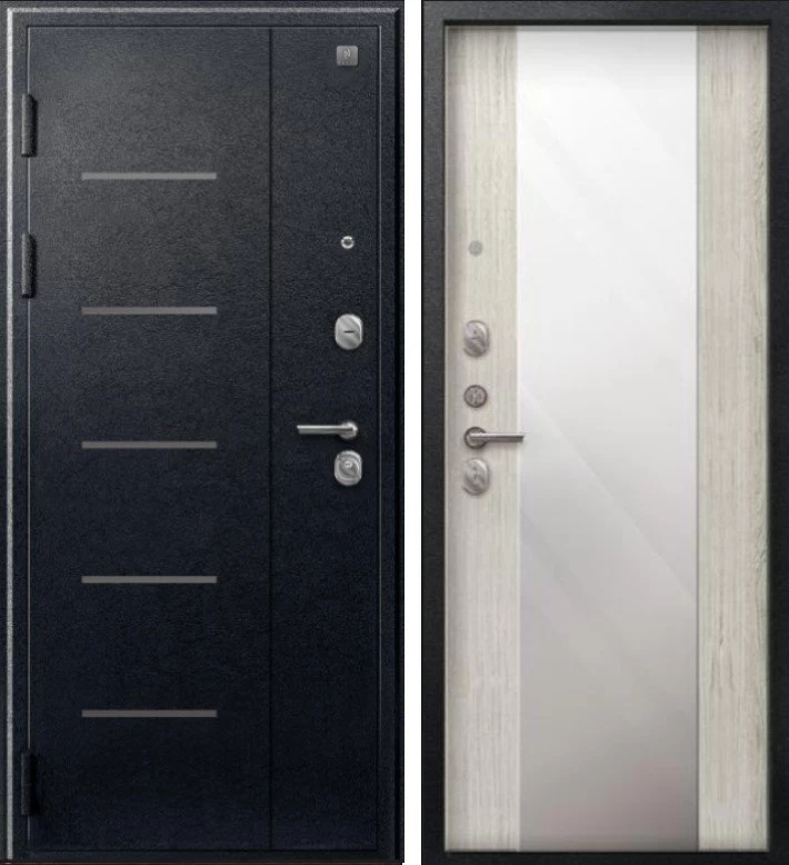 Надежная входная Дверь V-04 Черный муар - Полярный дуб Зеркало премиум класса по цене 43 667 руб. Большая толщина стали защитит от проникновения в ваш дом, квартиру или коттедж. Используется очень качественная фурнитура: замки, цилиндры, ручки, защелки. Покрытие и отделка двери изготовлено под внимательным контролем производителя. Дверь имеет долгий срок службы и гарантию.